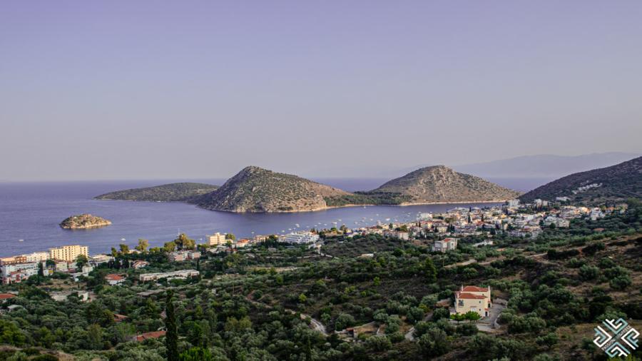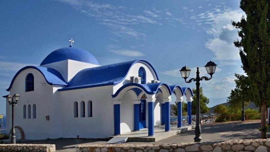 Agia Kyriaki, z którego rozciąga się piękny widok na zatokę.